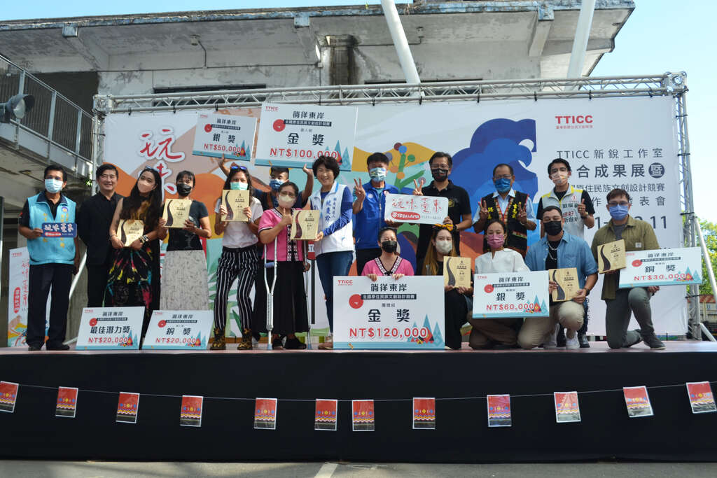 活動現場也舉行TTICC全國原住民族文創設計競賽得獎作品頒獎典禮,今年競賽主題為「徜徉東岸」,延續「永續生活、環境友善、傳承創新」的創作精神,思考人與地方的連結,以原民創作者的角度,在眾多與旅遊相關的各式用品,分享「徜徉東岸」的臺東自在生活提案,經過初審、打樣成品決選,選出個人組「金獎-徜徉包、銀獎-一針滾滾東去、銅獎-獵人包 Kakuni」;團體組「金獎-月光海野餐盒、銀獎-琉璃方塊包、銅獎-嶼者行澗」及不分組「最佳潛力獎-vuvu’s創皂」,期許未來這些得獎作品能貼近市場,兼具文化特色及商業性,成功進入通路進行銷售,讓更多民眾接觸原住民族文化,喜愛上原民文創產業。