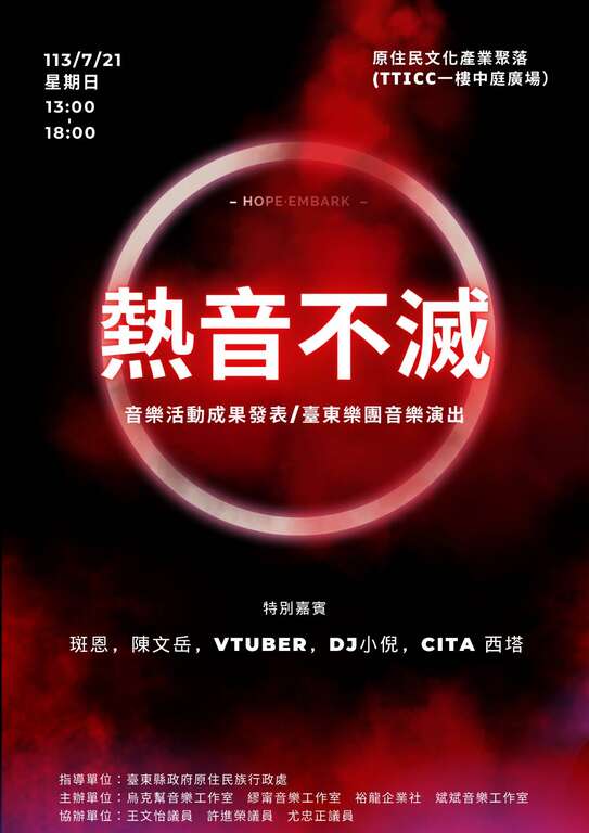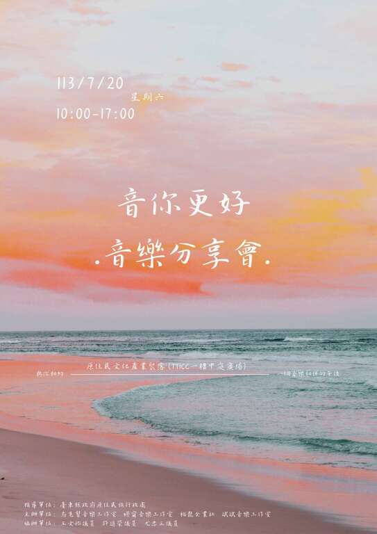 裴匡右老師於7/20(六)、7/21(日)兩日將在TTICC園區一樓廣場,舉辦音樂分享會,活動將由工作室學生以及各大單位學生一起參與表演,共同完成這項成果展演,免費入場,邀請大家一同來欣賞。 音樂活動成果發表特別嘉賓:斑恩、陳文岳、VTUBER、DJ小倪、CITA西塔地點:文創聚落TTICC中庭廣場時間:2024/7/20-10:00-17:00 ...