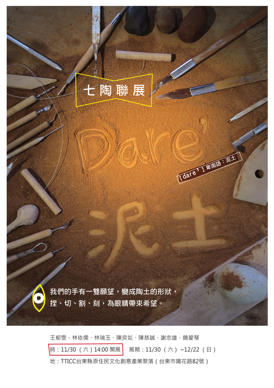 《七陶聯展》由駐村藝術家陳恭誠老師及陳奕彣老師,聯合新銳設計創作團隊林依儒老師、王郁雯老師、林瑞玉老師、謝忠雄老師及饒愛琴老師等,共7位陶藝家共同策展,dare(卑南語泥土)將各位老師連結到文創聚落,併著勞動的雙手,以捏、切、割、刻,呈現多樣陶土的形狀,展示駐村期間的創作成果。