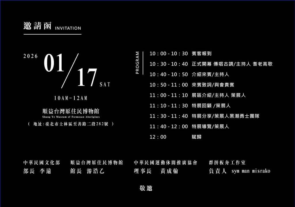 本展由本縣原住民文化創意產業聚落新銳創作工作室〈群拼板舟工作室〉張馬群及張世凱老師,透過影像、物件、行動與故事,呈現海洋不只是通道,更是文化的根源;勇士不只是航行者,更是記憶的守護者。邀請觀眾一同走進黑潮,感受跨越時間與海域的文化力量。