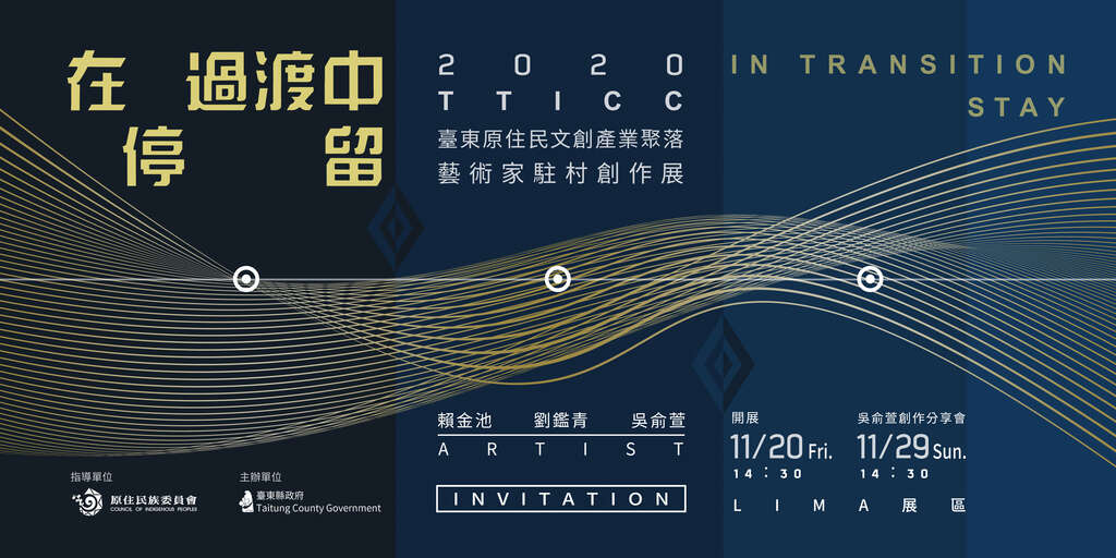由臺東縣政府原住民族行政處主辦的「在過渡中停留─TTICC原住民文創聚落藝術家駐村創作展」,將於2020年11月20日至2020年11月29日期間,在臺東縣原住民族文化創意產業聚落-LIMA展區展出,並於2020年11月20日下午14時30分整舉辦溫馨的開展交流茶會,小小的聚集,期待各界藝術家、藝文單位或有興趣的朋友來到展場一同觀展。