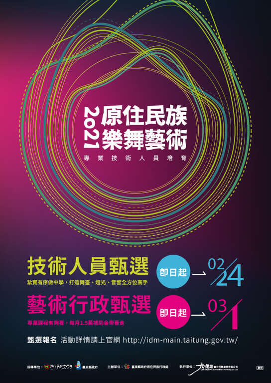 👉找尋立案於臺東縣並從事原住民族表演相關活動團體,協助培育團體的藝術行政人員專業知能與行動力,採取「先開課、後甄選」機制,入選者的推派團體將可獲得每個月新台幣15,000元補助金,並協助團體策劃專場演出及聯合演出,扶植團體的藝術行政人員能夠發揮最佳效能,成為團體最有力的專業好手!